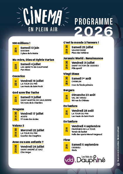 Du 13 juin au 5 septembre 2026, le Cinéma en plein air revient dans Les Vals du Dauphiné avec 14 projections gratuites de films sur 12 communes du territoire. Demandez l’programme !