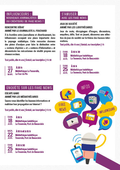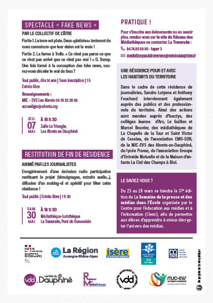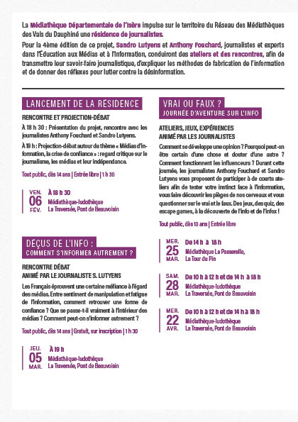 Pour cette 4ème édition Sandro Lutyens et Anthony Fouchard, journalistes et experts dans l’Éducation aux Médias et à l’Information, conduiront des ateliers et des rencontres dans les médiathèques des Vals du Dauphiné. L’objectif : partager les coulisses du métier, transmettre leur savoir-faire journalistique, expliquer les méthodes de fabrication de l’information et donner les bons réflexes pour repérer et lutter contre la désinformation.