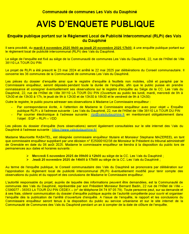 Il sera procédé, du mardi 4 novembre 2025 9h00 au jeudi 20 novembre 2025 17h00, à une enquête publique portant sur le règlement local de publicité intercommunal (RLPi) des Vals du Dauphiné.